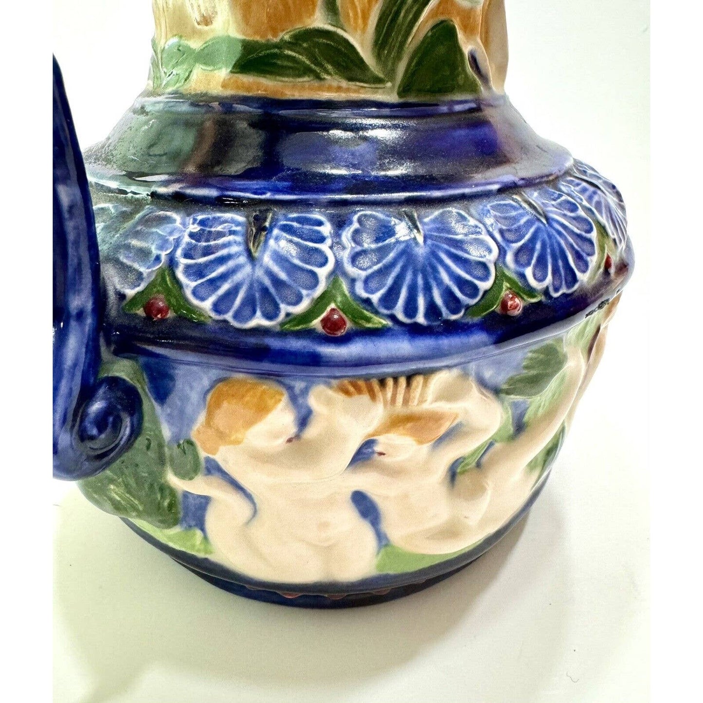 This unique ceramic pitcher features a beautiful cherub, mermaid, and merman design in a stunning Majolica style. The intricate pattern of the Fantasy-themed piece is sure to impress collectors and vintage enthusiasts alike. Measuring at a medium size, it is perfect for serving drinks or as a decorative piece in any home.